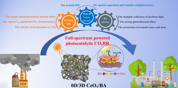 近日,我校能源材料与化工学院邓崇海团队在针对温室气体二氧化碳资源化转化为高附加值合成气(甲烷)方面取得重要研究进展,相关研究成果发表于工程材料类国际权威期刊《Chemical Engineering Journal》(中科院一区TOP,影响因子13.2),题为《Interfacial engineering of 0D/3D CeO2/BA nanoarchitectures for highly efficient and selective CO2 photo-reduction to CH4 based on full-spectrum solar-energy utilization》。