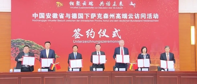 Am 16. Juli hielten die Provinz Anhui und das deutsche Bundesland Niedersachsen eine Videokonferenz zum Thema Virtuelles Zusammentreffen zur Diskussion über die Zukunft — Hochrangiger Virtueller Besuch zwischen der chinesischen Provinz Anhui und dem deutschen Bundesland Niedersachsen ab. An der Veranstaltung nahmen Li Jinbin, Sekretär des Komitees der Kommunistischen Partei der Provinz Anhui, Wang Qingxian, Gouverneur der Volksregierung der Provinz Anhui, Stephan Weil, Niedersächsischer Ministerpräsident, Zhang Xi, Vizegouverneur der Volksregierung der Provinz Anhui, Du Xiaohui, chinesischer Generalkonsul in Hamburg, Thomas Triller, amtierender deutscher Generalkonsul in Shanghai, und Wu Chunmei, Präsidentin der Universität Hefei teil.