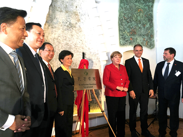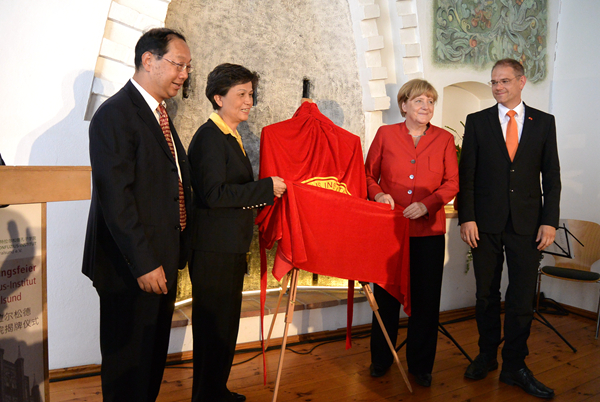 双方致辞后,默克尔与许琳等共同为孔子学院揭牌,这是默克尔本人及德国现任总理首次为孔子学院揭牌。