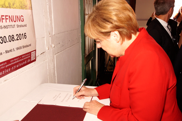 默克尔在致辞中首先回忆了去年与李克强总理在我校的友好会面,并表示,很高兴看到我校与德国高校间合作的良好发展,以及促成孔子学院最终落户施特拉尔松德。她希望这所孔子学院能为增进两国人民的交流和理解作出贡献并且对该孔子学院未来的发展充满信心。